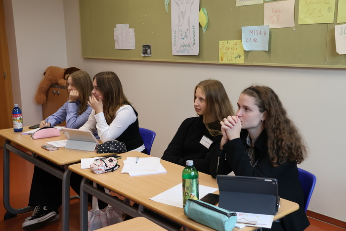 Souběžně probíhalo i školení debatních rozhodčích, které absolvovaly dvě naše starší členky (Marie Heidrová - 8.A, Radmila T. Moravcová – 7.A), těm po sedmi školících blocích, několika cvičně rozhodnutých debatách a akreditačním testu zbývá pouze počkat na potvrzení o získání akreditace (tudíž práva na rozhodování debat).