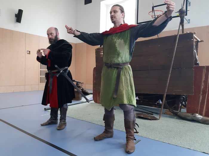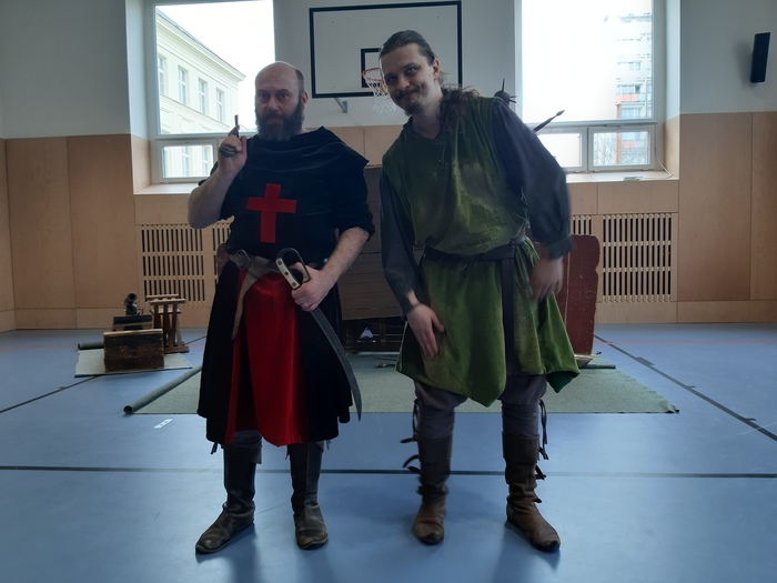 Poslední březnovou středu se malá tělocvična naší školy proměnila v živou učebnici dějepisu. Pro žáky primy, sekundy a tercie byl připraven vzdělávací program Jak válčili husité, který jim přiblížil nejen dobu husitských válek, ale i každodenní realitu tehdejších bojovníků. Žáci si mohli zblízka prohlédnout, a dokonce i vyzkoušet zbraně, zbroj i bojové techniky husitských válečníků i jejich protivníků, křižáckých rytířů. Nešlo přitom jen o pasivní sledování, kdo chtěl, aktivně se zapojil, prokázal teoretické znalosti a přišlo i na dovednosti praktické, bojové.
