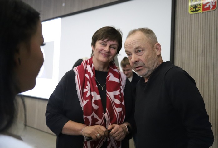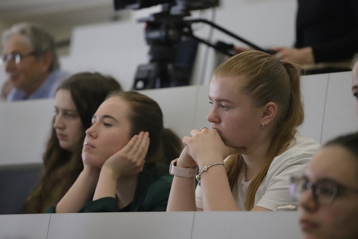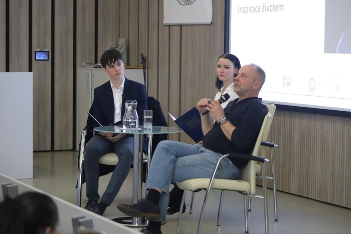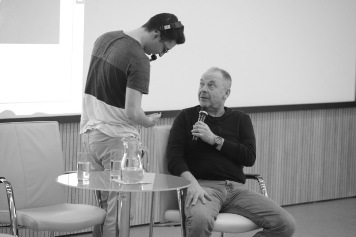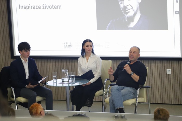 Široký tok vyprávění na téma Inspirace životem, v němž se proplétaly osobní zkušenosti s uměleckou tvorbou a hodnotovými postoji a který přesto nebyl bezbřehý, ale plynul dramaticky kupředu, poslouchala naprostá většina v sále jedním dechem a bylo těžké jej přerušit pro druhou část programu, již moderovali Nora Tenglerová (8.A) a Mikuláš Celta (7.A).