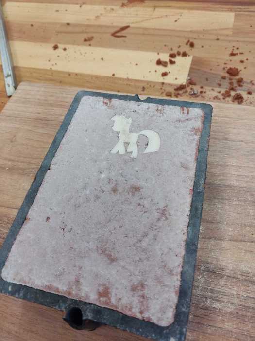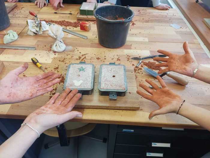 Nejdřív jsme si ale museli připravit samotnou formu na odlitek. Vybraný vzor jsme umístili na dno formy, a „pocukrovali“ ho směsí mastku s křemelinou. Na ni jsme postupně vrstvili slévárenský písek, který měl stejnou barvu jako korpus cheesecaku. Skoro nám přišlo, že jsme v cukrárně a pečeme dorty. Nakonec přišlo hloubení otvorů pro vstup taveniny, a výstup plynů. Mírné zklamání nastalo, když jsme zjistili, že formy nakonec nevyužijeme, i tak jsme si jejich přípravu moc užili.