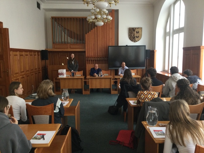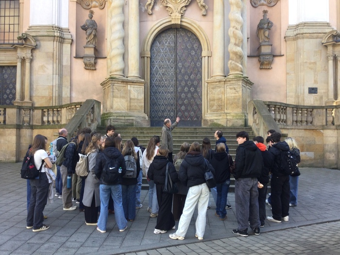 Ve středu dopoledne jsme se po přivítání vedením školy a po zhlédnutí krátkých videí o Opavě přesunuli na Horní náměstí do budovy radnice zvané Hláska. Zde nás slavnostně přijal náměstek primátora, který nás seznámil s chodem města i jeho zajímavostmi. Součástí setkání byla také beseda, během níž měli studenti možnost klást otázky a dozvědět se více o místní správě i životě ve městě. Po besedě následoval výstup na radniční věž Hlásku, odkud jsme si mohli prohlédnout naši slezskou metropoli z ptačí perspektivy. Němečtí studenti se pak měli možnost seznámit se zajímavými místy Opavy formou „Stadtrallye“, kterou pro ně připravili čeští přátelé.
