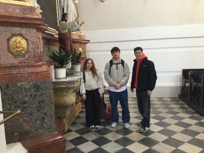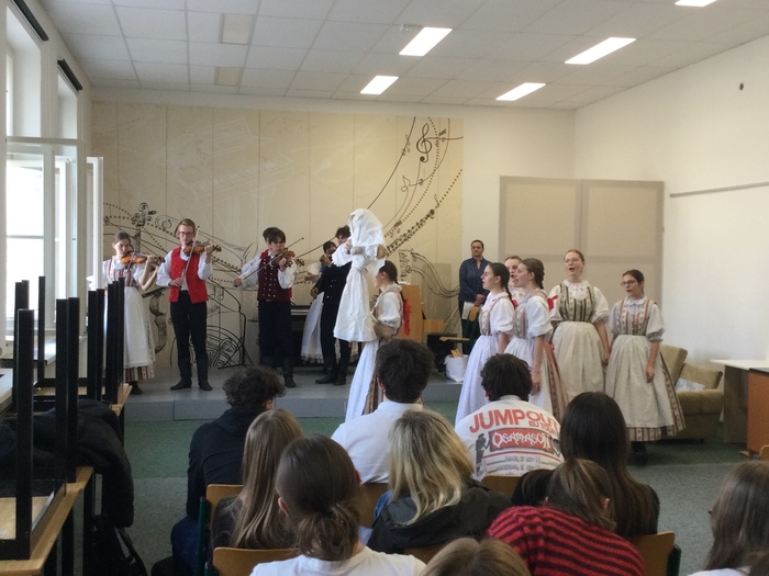 Úterý bylo převážně ve znamení hudby. Ráno měli němečtí studenti možnost navštívit některé vyučovací hodiny na naší škole a poté jsme se všichni vypravili do konkatedrály Nanebevzetí Panny Marie, kde jsme si poslechli varhanní hudbu a řešili velikonoční kvíz. Po obědě ve školní jídelně následoval v hudebně program Dětského folklorního souboru Úsměv na téma „Od masopustu po Velikonoce“ s lidovými tanci, písněmi a rytmikou, inspirovaných bohatou tradicí Opavského Slezska.