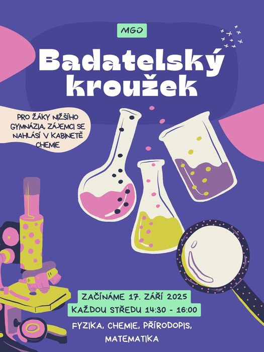 Milí studenti, pojďte s námi bádat ve fyzice, chemii, přírodopise a v matematice. Badatelský kroužek je určen pro studenty nižšího gymnázia. Bude probíhat vždy ve středu v době od 14:30 do 16:00 hodin. Můžete se hlásit v kabinetě chemie do 16. září. První setkání účastníků Badatelského kroužku proběhne ve středu 17. září 2025 v chemické laboratoři. Těšíme se na vás. Budou se vám věnovat vyučující: paní Bitomská, paní Lidmilová, paní Hanzliková, pan Šťastný a pan Hruda a vyzkoušíte si také práci v odborných laboratořích. Tento zájmový kroužek je zdarma a je zcela hrazen z projektu "Implementace Dlouhodobého záměru Moravskoslezského kraje".