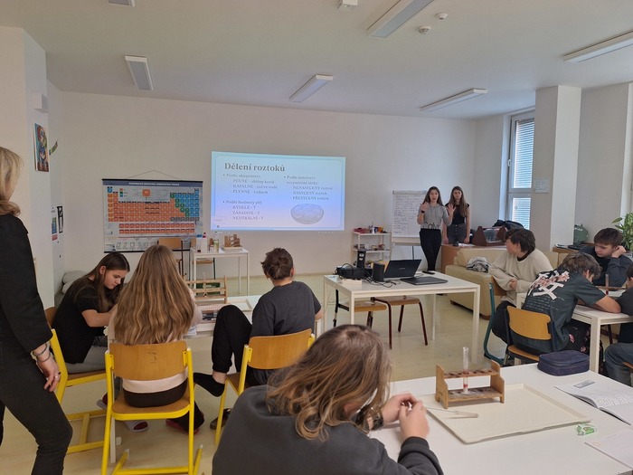 Naši studenti 1. – 4. ročníků mají jedinečnou možnost vyzkoušet si, jaké je to stát za katedrou. Mohou vyučovat studentské lekce, vždy v tandemu, na téma, jaké si sami vyberou. Několik let již spolupracujeme se ZŠ Labyrint ve Lhotě u Opavy, se ZŠ Via Monntessori v Hllučíně a letos jsme zahájili také spolupráci se ZŠ Nový Svět v Opavě. Na všech těchto školách mohou studenti vést dvouhodinové studentské lekce z přírodopisu, chemie, fyziky a ze zeměpisu. S předstihem se vždy připravují pod vedením vyučujících: Zdeňky Hanzlikové a Veroniky Řehulkové, které se starají o odbornou a didaktickou stránku lekcí. Další pomoc poskytují vyučující: Adam Šťastný, Jiří Robenek, Adam Wiltsch a Eliška Selveková. Děkujeme všem vyučujícím za jejich podporu, ochotu a vstřícnost a vkládáme názory studentů, kteří již mají tu zkušenost a ví, jaké to je, být učitelem.