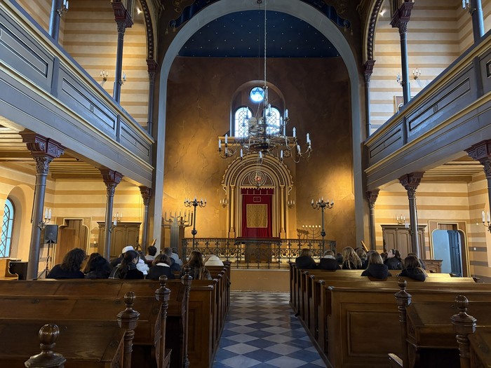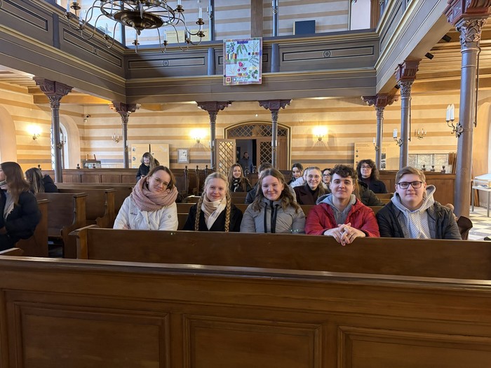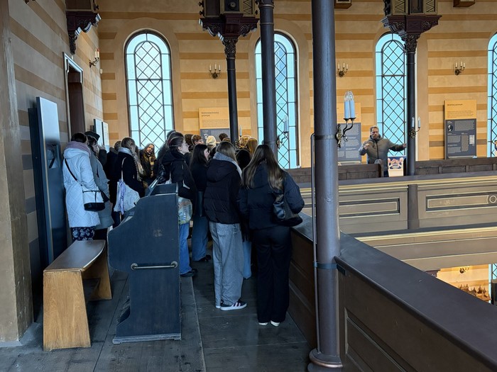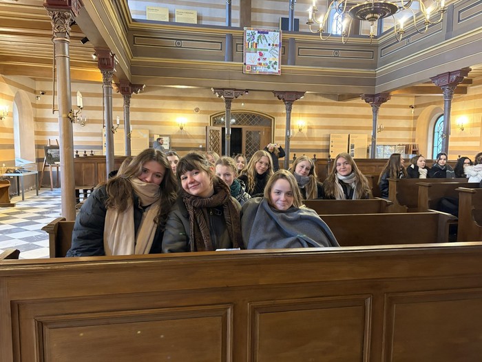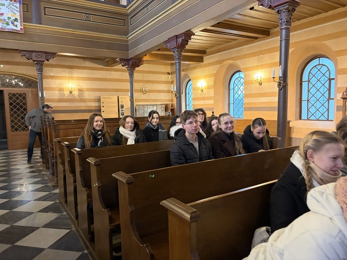 Aby si student dokázal učivo skutečně osvojit, nestačí pouze teoretický výklad, ale také přímá zkušenost. Právě proto se studenti třetích ročníků semináře ze společenských věd 11. února vydali do synagogy v Krnově, kde si v rámci výuky religionistiky rozšiřovali své poznatky o judaismu. Autentické prostředí synagogy jim umožnilo lépe porozumět historii, náboženským tradicím i kultuře nejstaršího monoteistického náboženství na světě. Celým programem je provázel ochotný a vstřícný průvodce, který studentům přiblížil nejen synagogu jako takovou, ale i osudy židovské komunity v regionu. Součástí krnovské synagogy je rovněž stálá muzejní expozice věnovaná židovským podnikatelům působícím v Krnově a na Opavsku. Výstava nabízí cenný pohled na jejich přínos hospodářskému i společenskému rozvoji regionu a připomíná významnou kapitolu místních dějin.